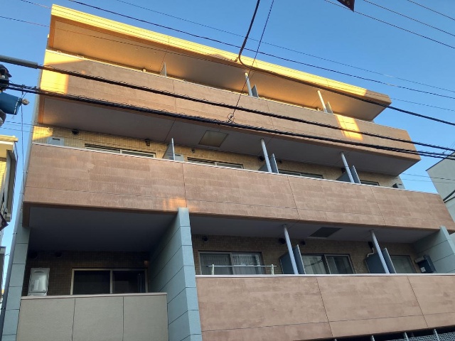 周囲の落ち着いた街並みの雰囲気に馴染む、ベージュ系タイル張りの外観です。