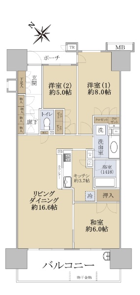 【18階・ノースタワー/北向きビューバス住戸】1LDK/55.05u