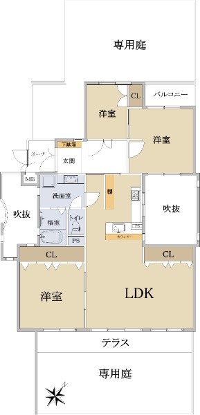 専有面積:91.89u 間取り:3LDK 専用庭付