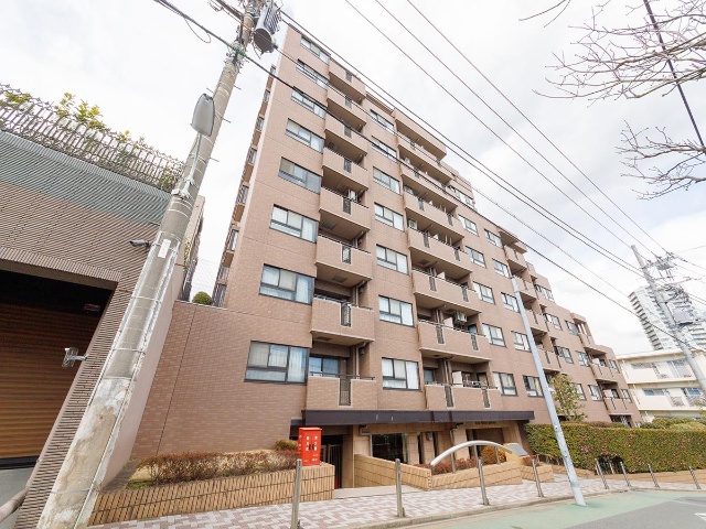 赤褐色の外壁が印象的。日当たり良好不動前の高級スタンダードマンション。