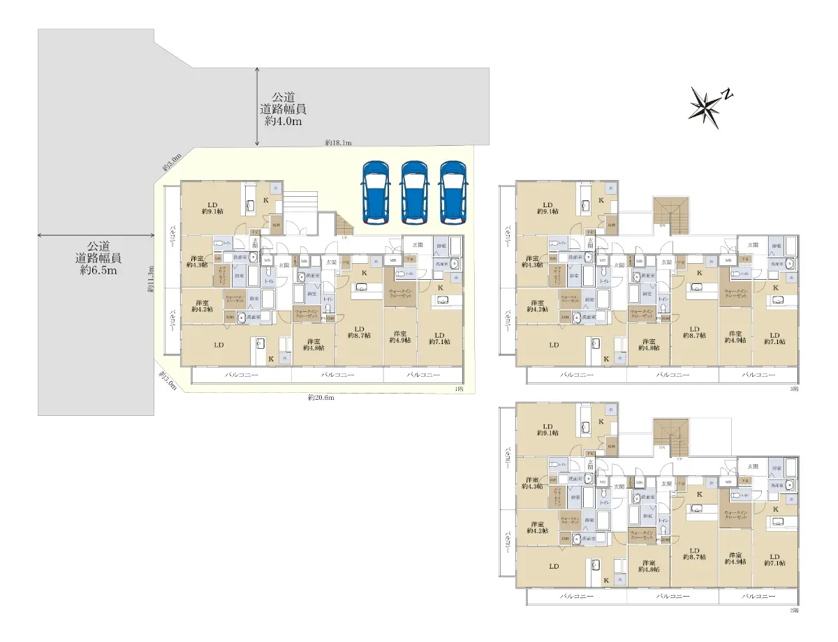 | 接道状況 | 角地・南西6.5m(公道)接面11.3m/北西4m(公道)接面18.1m |
