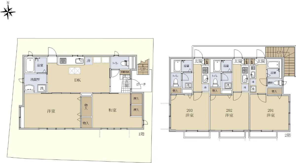 賃貸併用住宅として、1階の居住用部分と2階の賃貸部分(1K×3部屋)となっております。
