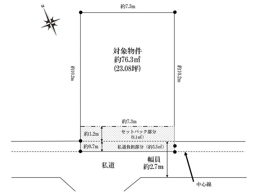 | 接道状況 | 一方道路・南西2.7m(私道)接面7.3m |