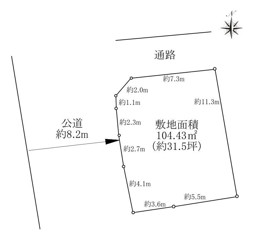 | 土地面積 | 104.43m2(約31.59坪)※実測/他に私道負担:13.62m2あり |