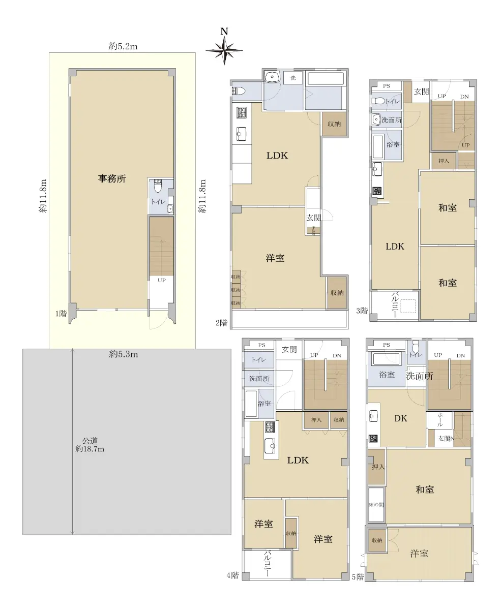 (1階:57.19u、2階:55.70u、3階:53.90u、4階:53.90u、5階:51.50u)