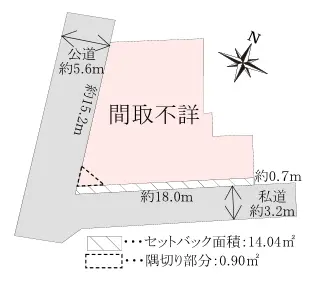 | 接道状況 | 角地・南西5.6m(公道)接面15.2m/南東3.2m(私道)接面18m |
