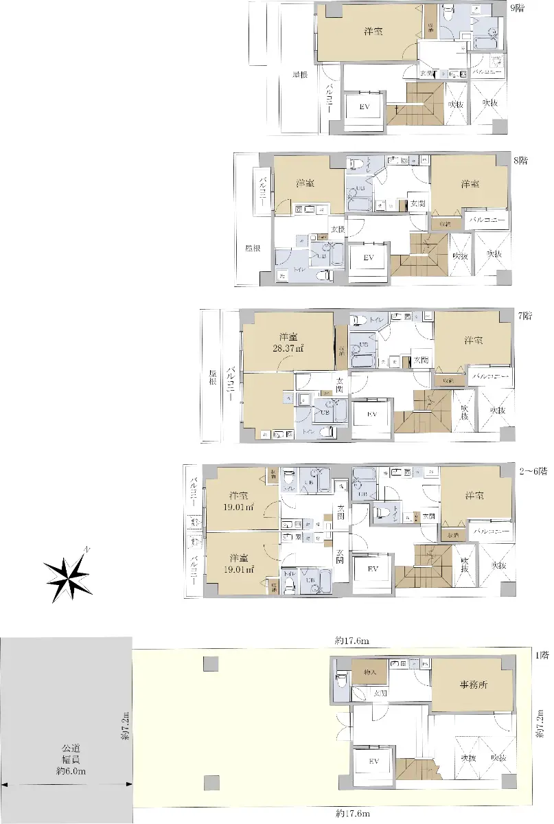 | 各住戸の専有面積 | 最小18.83m2〜最大28.37m2 |