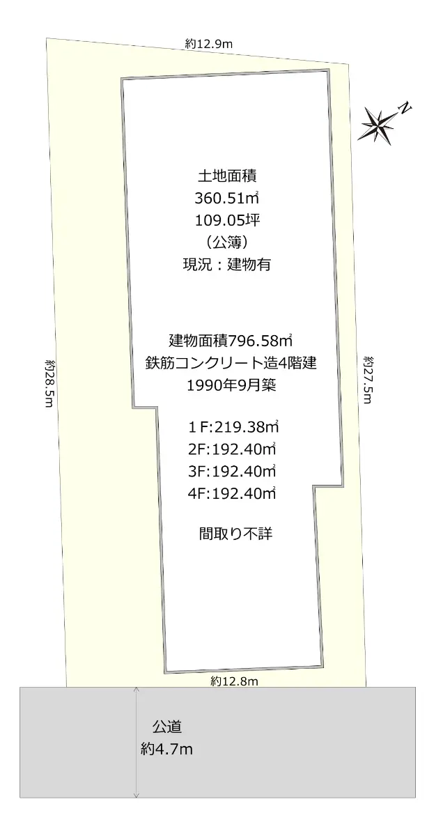 | 接道状況 | 一方道路・南東4.7m(公道)接面12.8m |