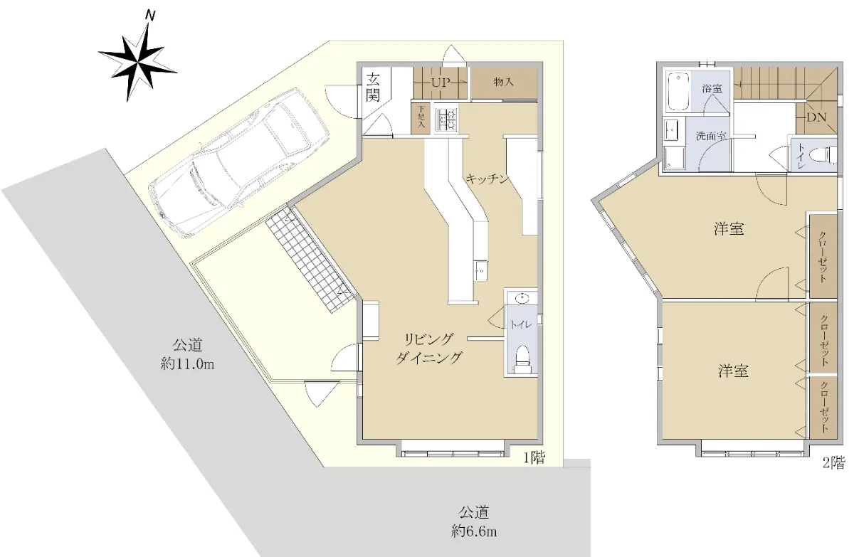| 接道状況 | 角地・南西11m(公道)接面9m/南東6.6m(公道)接面6m |