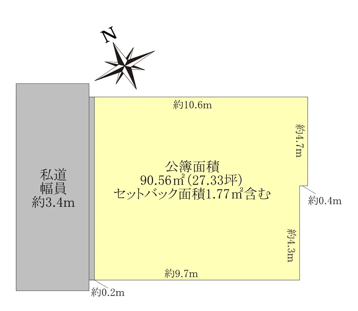 | 土地面積 | 90.56m2(約27.39坪)※公簿/セットバック:1.77m2含む/他に私道負担:19.02m2あり |
