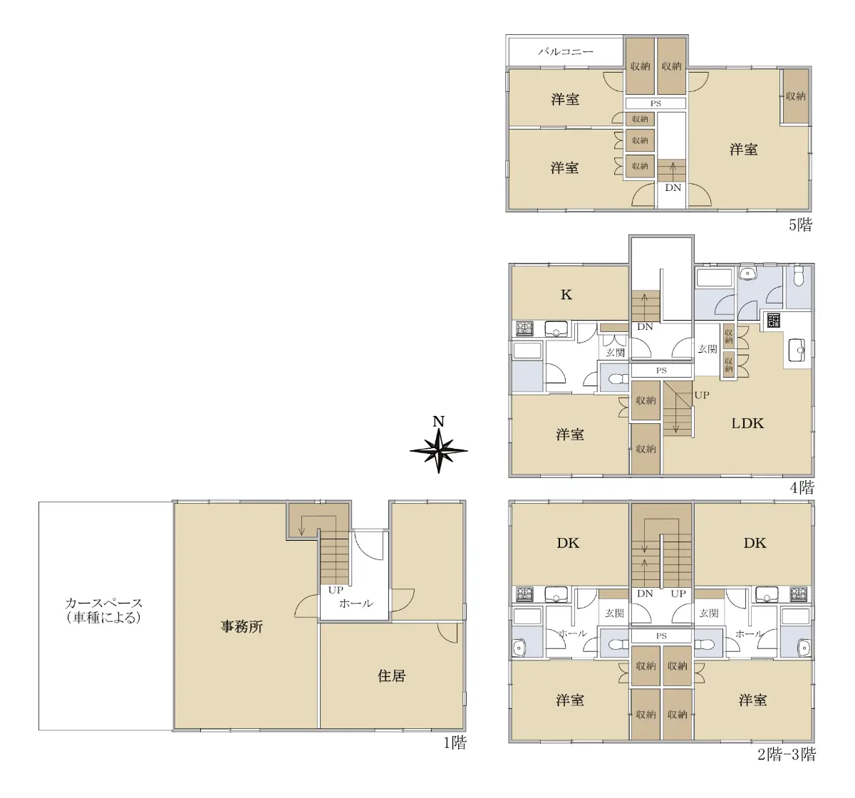 ・各階面積:1階〜3階各72.00u、4階65.92u、5階45.40u