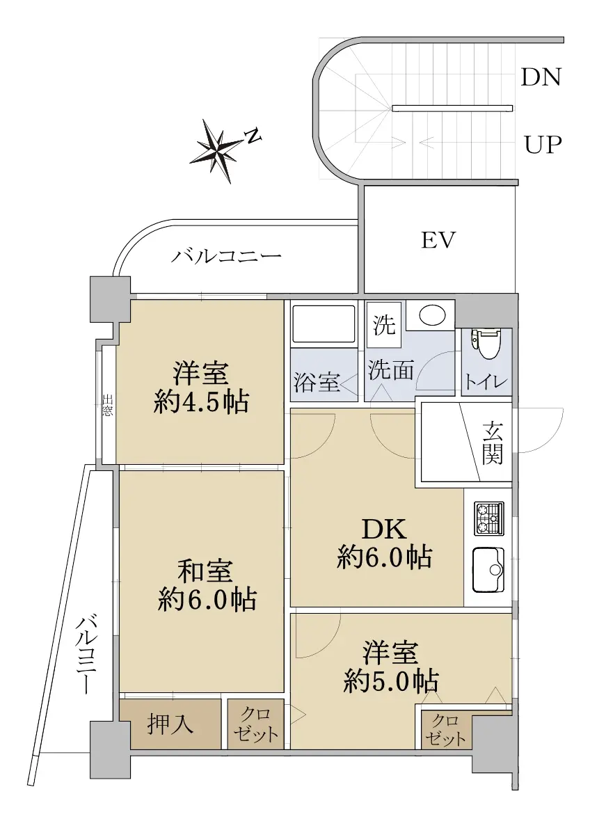 こちらのお部屋は5階部分に位置しており、専有面積46.37u、3DKの間取りで南向き角住戸のため、陽当たり・風通し良好です。