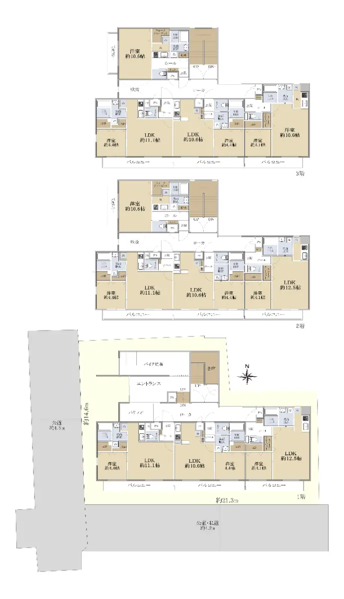 | 接道状況 | 二方道路・南4.2m(私道)接面21.3m/西4.5m(公道)接面14.6m |