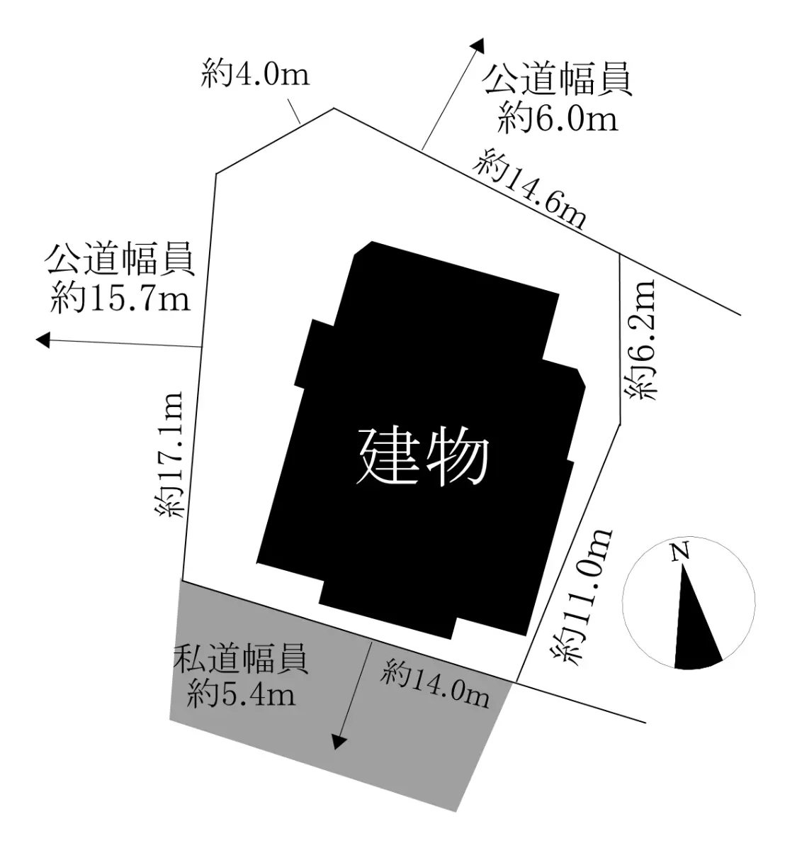 | 接道状況 | 三方道路・西15.7m(公道)接面17.1m/北東6m(公道)接面14.6m/南西5.4m(私道)接面14m |