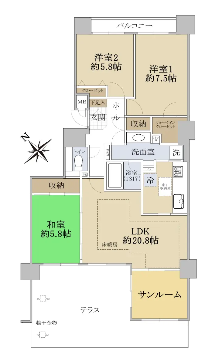 ◆間取り:3LDK(専用テラス、サンルームあり)