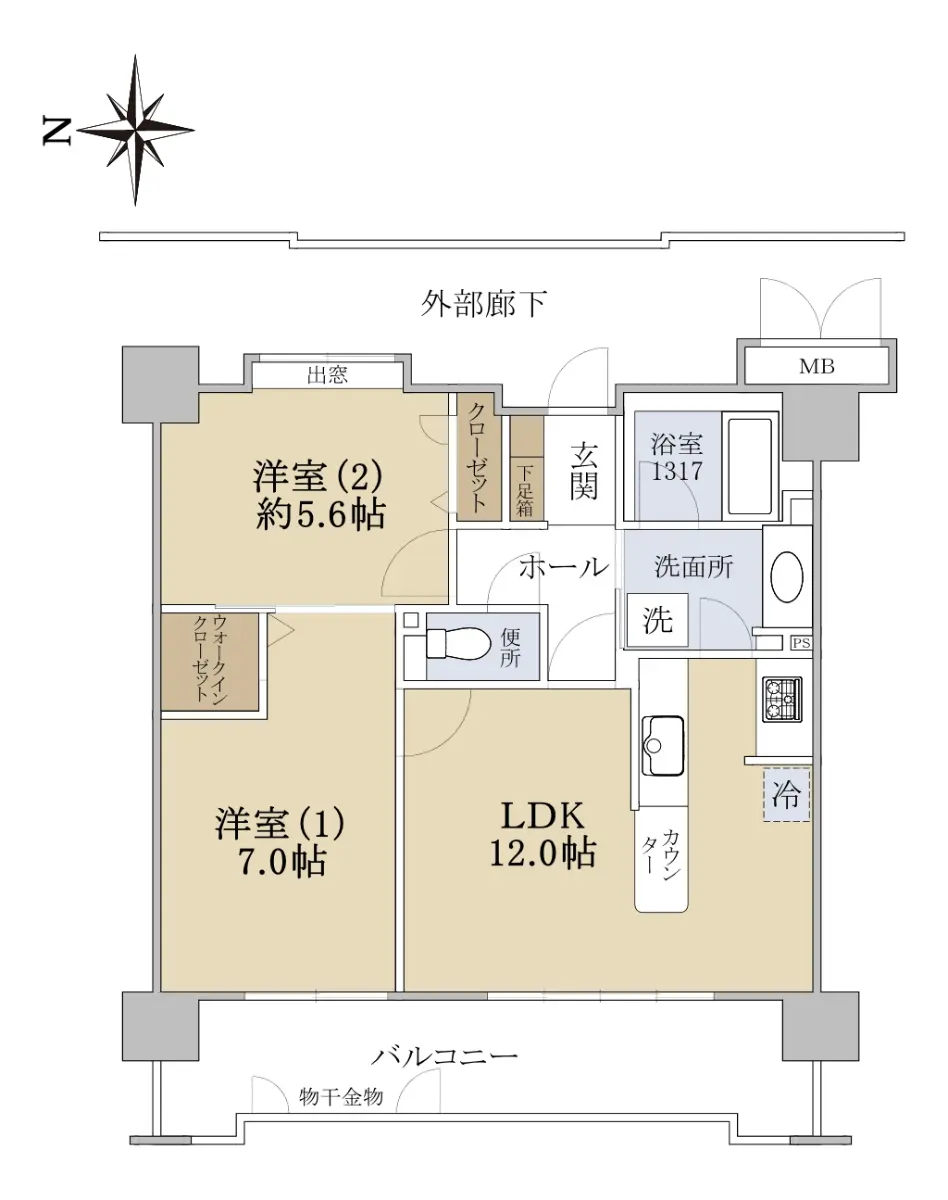 専有面積56.43uに、デッドスペースとなりがちな廊下部分を抑えた効率的な2LDKのお部屋になります。