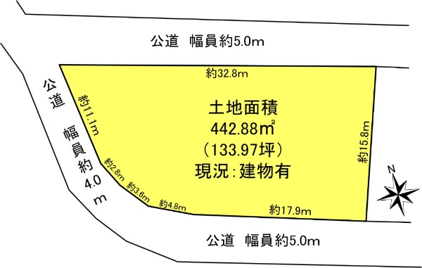 ■三方道路 ■敷地面積:442.88u(133.97坪)■建築条件付土地ではありません