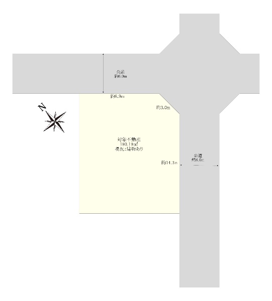 南東側約6.0m公道、南西側約6.0m公道の角地、陽当り良好。