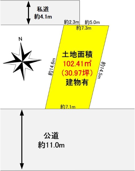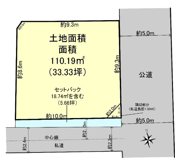 〇●東側道路約5.0m・南側私道2.3mの角地●〇