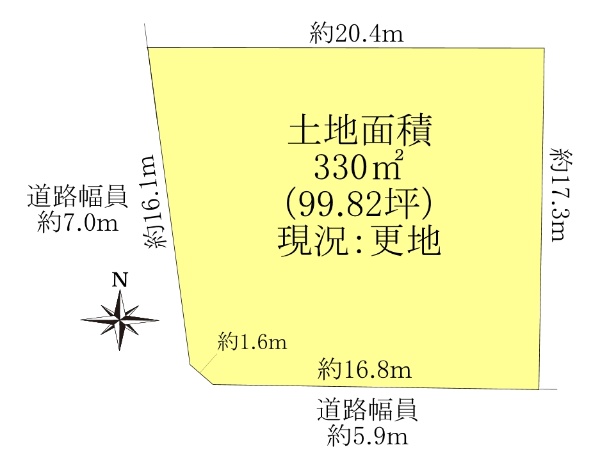 ☆南西角地の整形地 土地面積:330u(99.82坪)