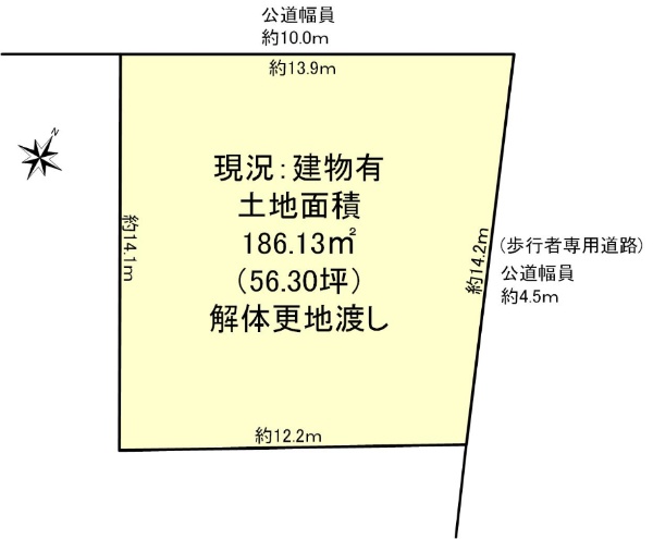 北東角地 土地面積186.13u(56.30坪) 解体更地渡し 平坦地