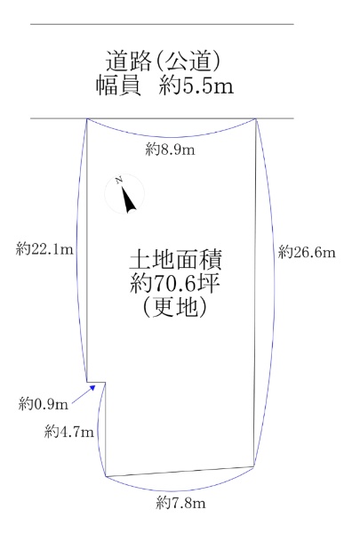 【建築条件なし】北西・南の二方接道 土地面積176.49u(約53.38坪)