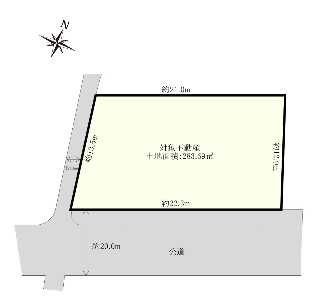 | 接道状況 | 角地・南20m(公道)接面22.3m/西4.6m(公道)接面13.5m |