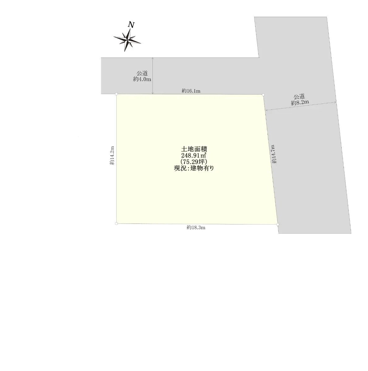 | 接道状況 | 角地・北4m(公道)接面16.1m/東8.2m(公道)接面14.7m |