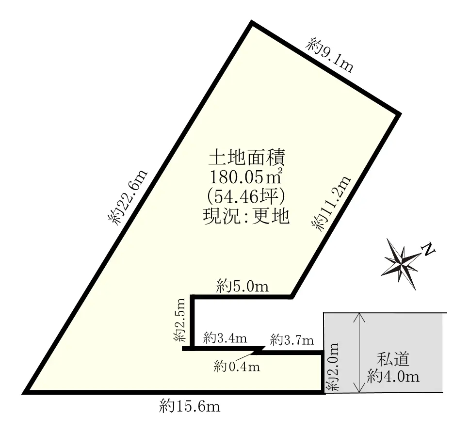 | 接道状況 | 一方道路・北東4m(私道)接面2m |