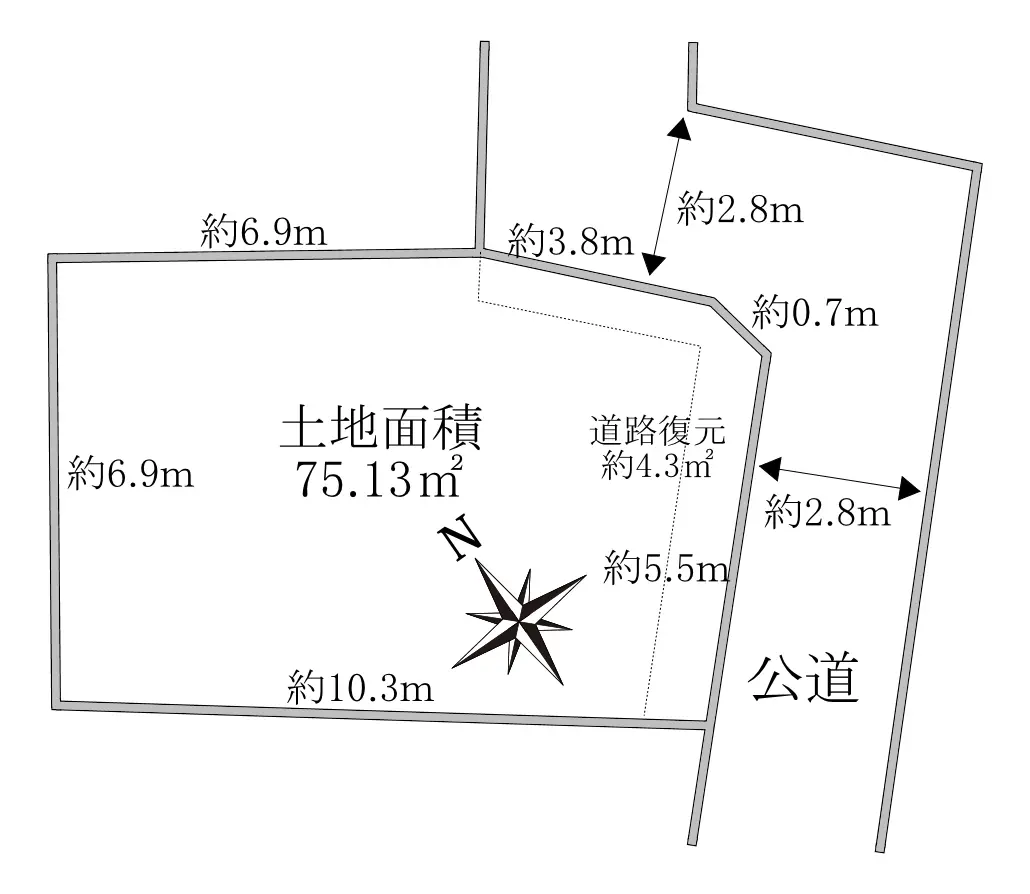 | 接道状況 | 一方道路・南東2.8m(公道)接面7m |