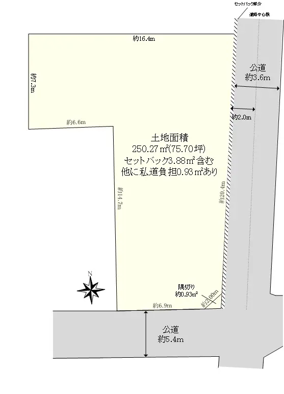 | 土地面積 | 250.27m2(約75.70坪)/セットバック:3.88m2含む/他に私道負担:0.93m2あり |