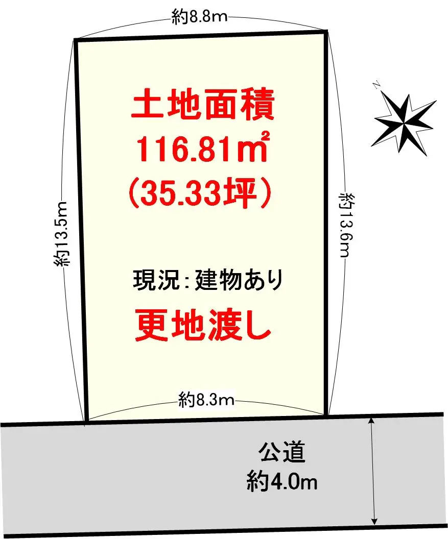 | 接道状況 | 一方道路・南西4m(公道)接面8.3m |