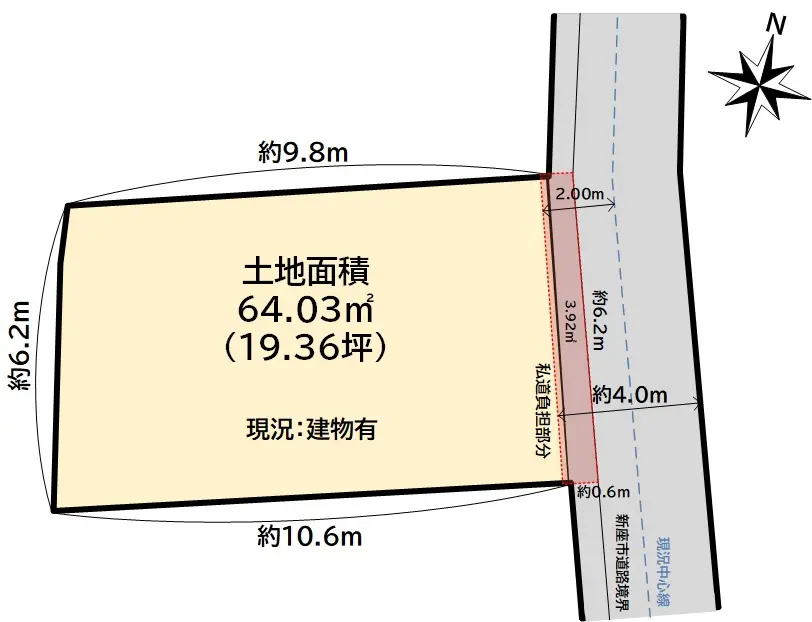 | 土地面積 | 64.03m2(約19.36坪)/セットバック済み/他に私道負担:3.92m2あり |