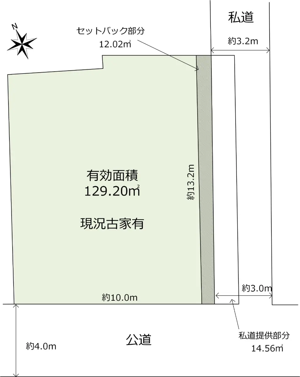| 接道状況 | 角地・南西4m(公道)接面10m/南東3m(私道)接面13.2m |