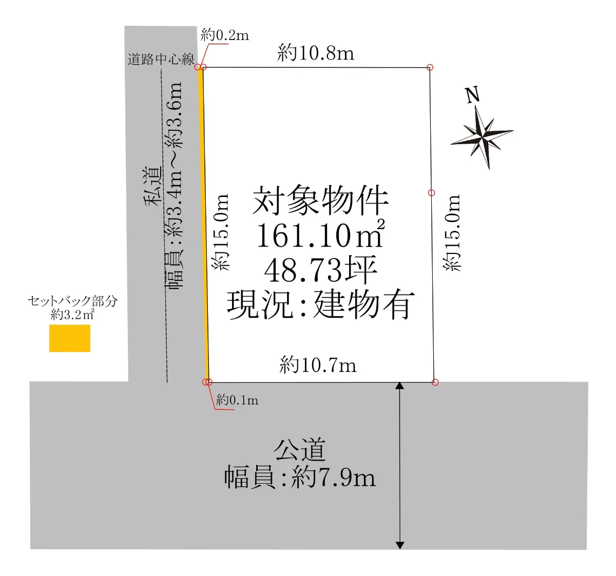■角地:南西公道(幅員約7.9m、接面約10.7m)、北西私道(幅員約3.4m、接面約15.0m)