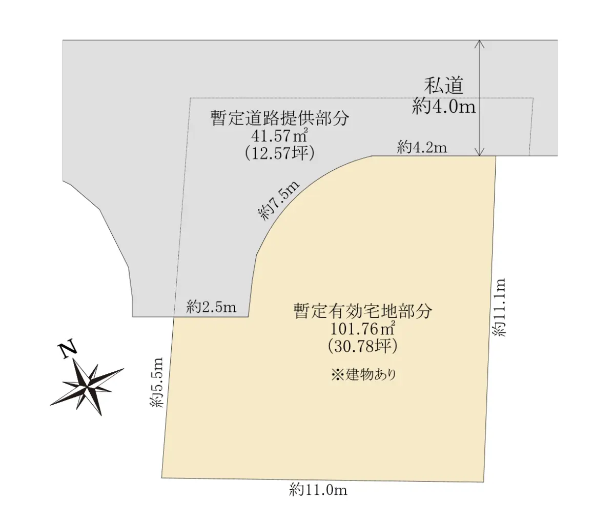 | 土地面積 | 101.76m2(約30.78坪)/セットバック済み/他に私道負担:47.81m2あり |