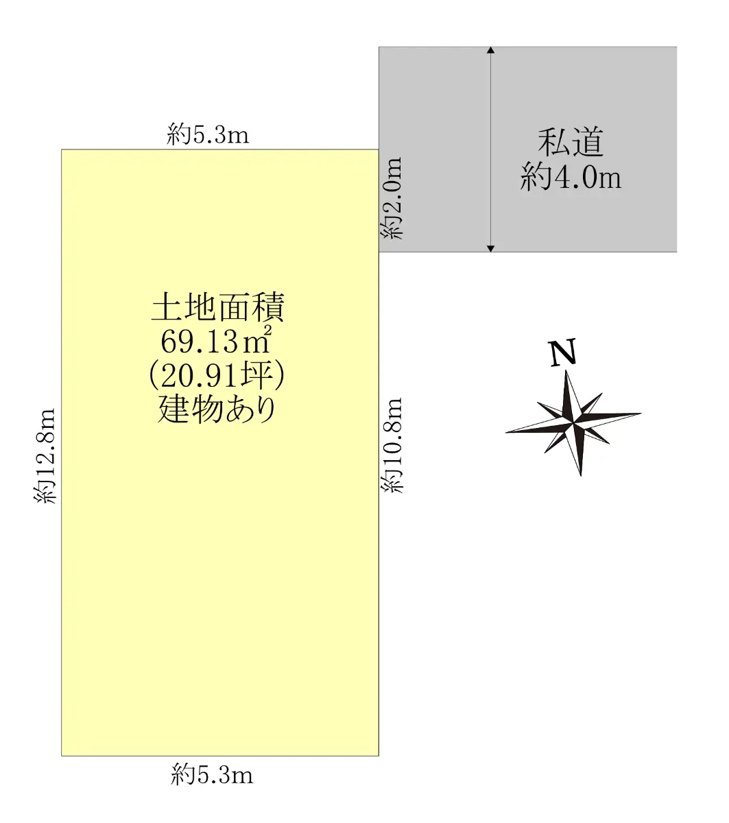 | 土地面積 | 69.13m2(約20.91坪)※公簿/他に私道負担:3.89m2あり |