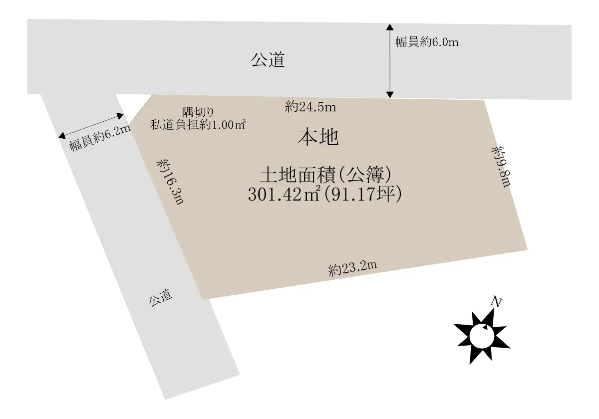 | 接道状況 | 角地・北西6m(公道)接面24.5m/南西6.2m(公道)接面16.3m |
