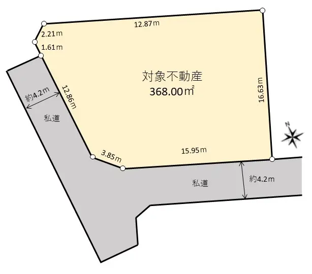| 接道状況 | 二方道路・西4.2m(私道)接面12.8m/南4.2m(私道)接面15.9m |