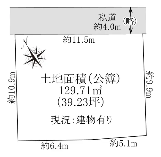 | 接道状況 | 一方道路・北東4m(私道)接面11.5m |