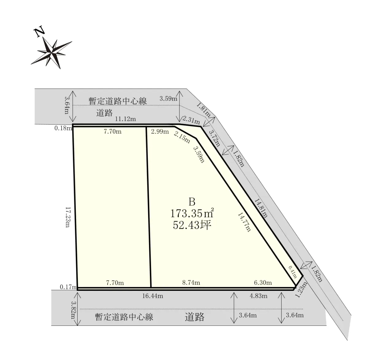| 接道状況 | 二方道路・南西3.6m(公道)接面15m/東1.8m(公道)接面14.8m/北東3.5m(公道)接面2.9m |