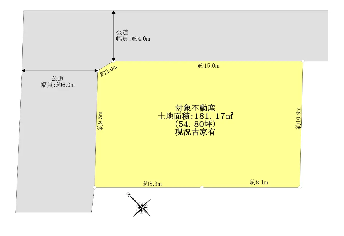 | 接道状況 | 角地・北東4m(公道)接面15m/北西6m(公道)接面9.5m |