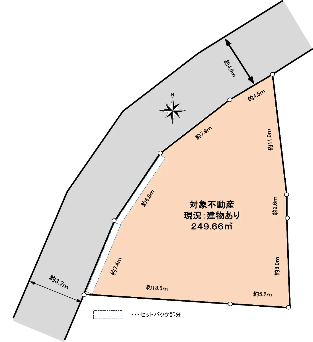| 接道状況 | 一方道路・北西3.7m(私道)接面26.6m |