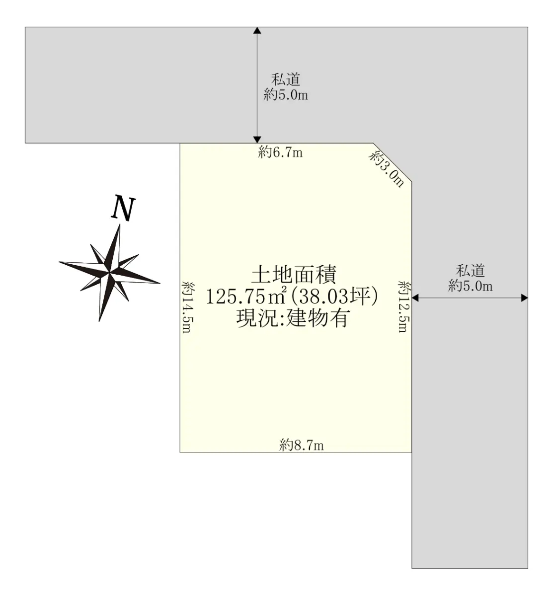 | 接道状況 | 角地・北東5m(私道)接面12.5m/北西5m(私道)接面9.7m |