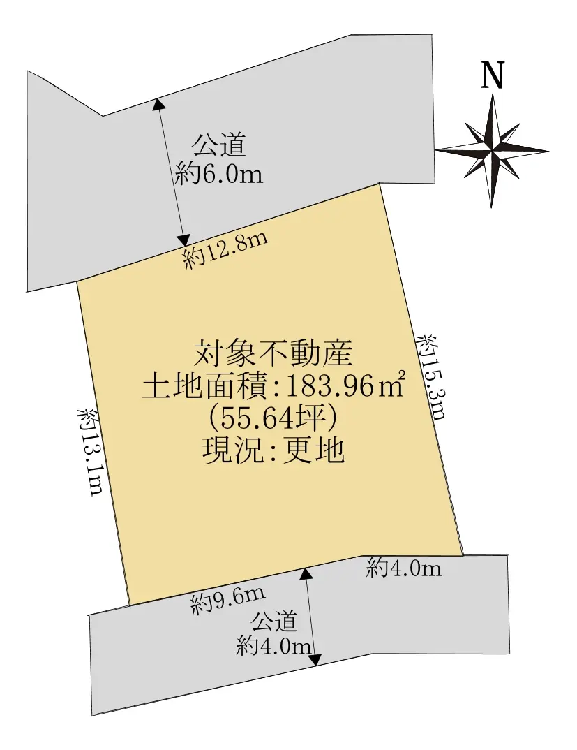 | 接道状況 | 二方道路・北西6m(公道)接面12.8m/南東4m(公道)接面13.6m |