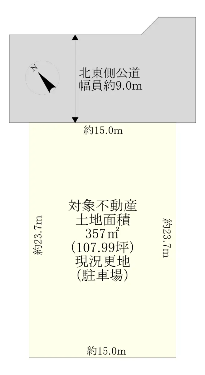 ◎北東側公道(幅員約9.0m、間口約15.0m)に面する整形地