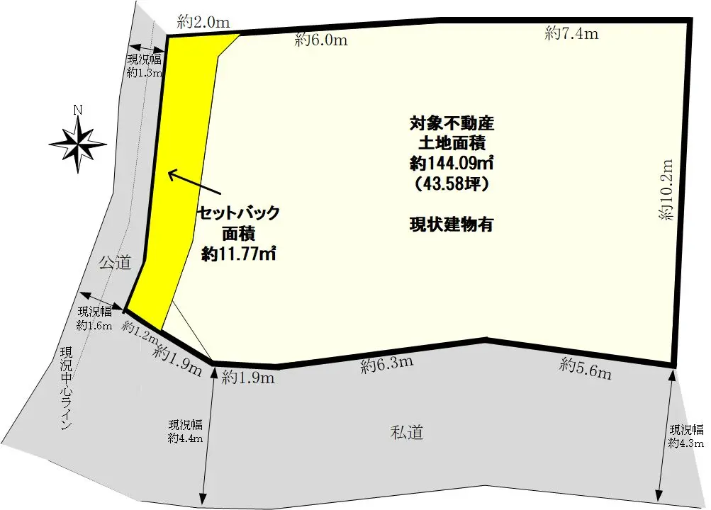 | 土地面積 | 144.09m2(約43.58坪)※公簿/セットバック:11.77m2含む/他に私道負担:115.68m2あり |