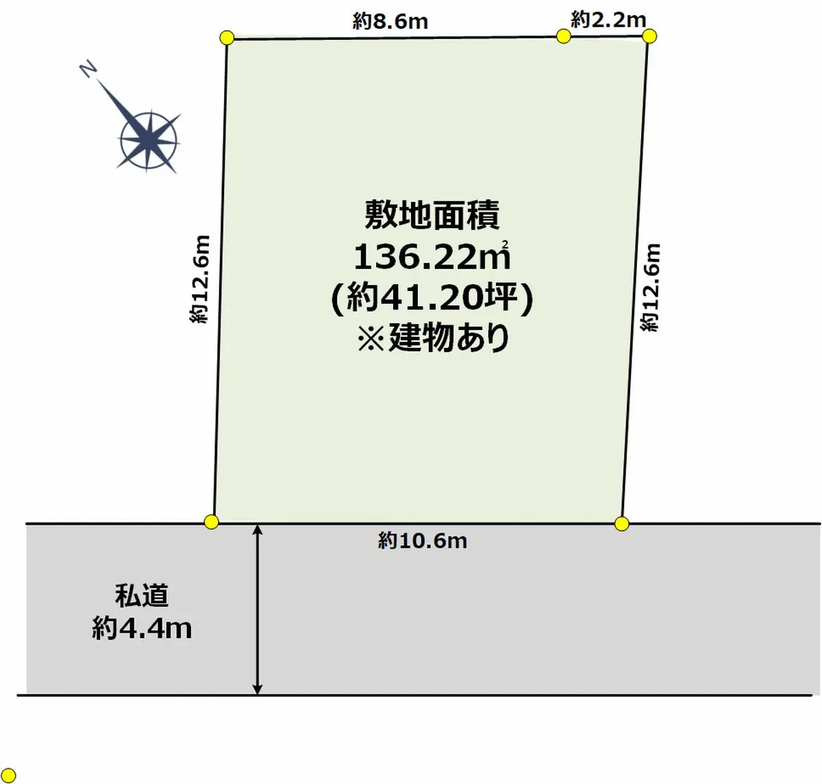 | 接道状況 | 一方道路・南西4.4m(私道)接面10.6m |
