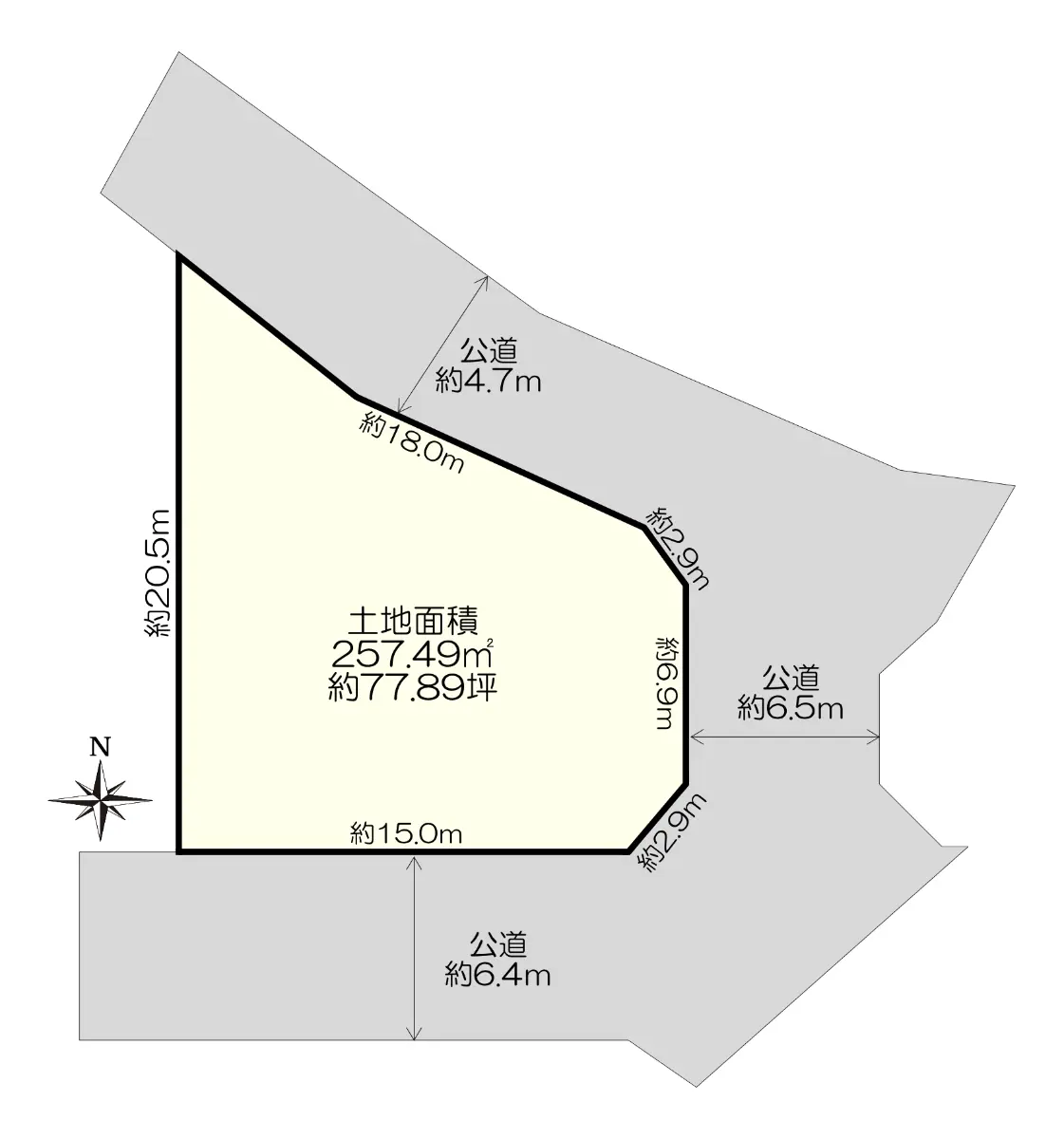 | 接道状況 | 三方道路・北東4.7m(公道)接面18m/東6.5m(公道)接面6.9m/南6.4m(公道)接面15m |