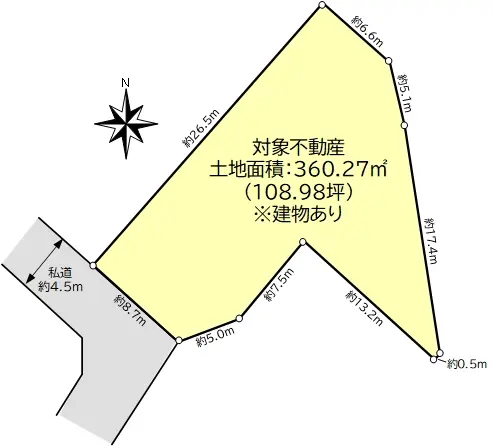 | 土地面積 | 360.27m2(約108.98坪)/傾斜地:72.43%、260.96m2含む/他に私道負担:17.64m2あり |